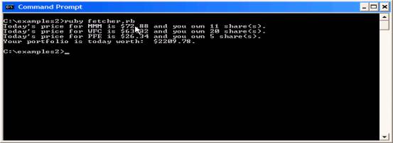 为使应用程序工作,请下载并把本文相应的源码文件解压到你的文件系统上。在解压后,将生成一个examples2文件夹。共有4个Ruby代码文件(.rb文件)和一个文本文件holdings.txt。fetcher.rb文件用作执行股票行情检索的代码。为了运行这个示例应用程序,打开一个命令提示符并使用Ruby运行fetcher.rb文件即可。