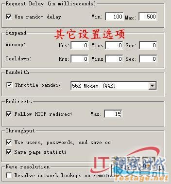 “Rpquest Delay”设置延迟时间,我们设置为100~500。“Suspend”设置设定挂起时间,Warmup时间是初始化测试运行时间,cooldown时间就是指定结束阶段的测试时间。Bandwith”指定带宽瓶颈,允许你模拟从14.4 Kbps的modem连接到T1 (1.5 Mbps)的Local Area Network (LAN)连接的网络带宽。Redirects设置重定向时间,“Throughput”设置用户、密码页面状态保存等是否启用,“Name resolution”设置是否进行名称解析。所有以上的选项大家可以根据自己的需要进行设置。(图3)
