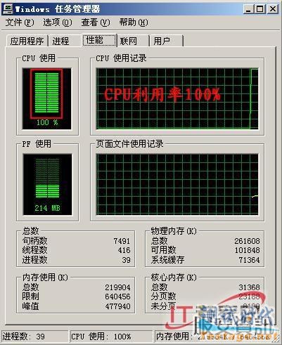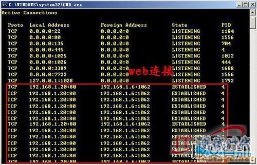 第二步:在“Settings”的功能设置中将Stress level (threads)线程数设置为1000。完毕后,点工具中的灰色三角按钮即可进行测试。测试过程中我们可以从服务器的任务管理器中看到CPU使用率已经 达到100%,损耗率达到最大见图5。在CMD窗口中使用命令netstat -an,可以看到客户端的IP地址在服务器上的80端口进行了非常多的连接见图6,而且Web网站已经打不开了,提示过多用户连接。(图5)(图6)