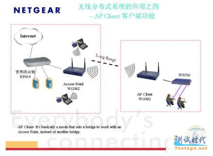 NETGEAR无线访问点WG302和WG602与WG101桥接器配合使用,可提供标准的AP Client应用工作模式。