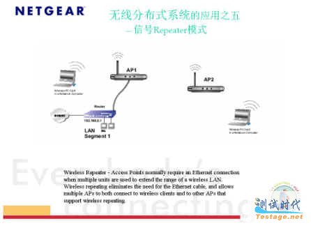 NETGEAR 无线分布式系统(WDS)的无线中继模式,提供了全新的无线组网模式。可适用于那些场地开阔,不便于敷设以太网线的场所,象大型开放式办公区域,仓储, 码头等区域。
