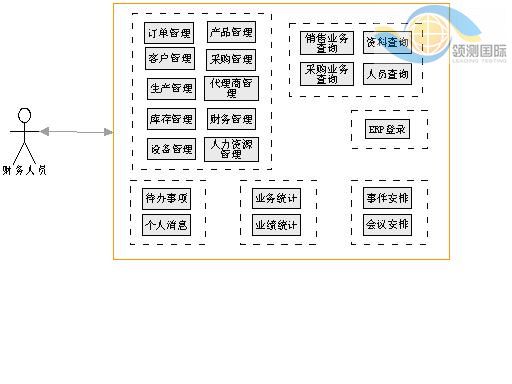 这样的设计思路也体现了SOA的自顶向下的设计方法:功能模块->服务->组件和业务对象。服务不是凭空想象出来的,它必须要满足客户的需求,而客户需求的体现就是系统要提供的功能,所以功能模块的设计是服务设计的前提。以我们团队这次IBM大赛的方案为例子,我们在理解大赛组委会给出的业务需求外,自己也设想了一些需求,对应这些需求,我们设计了系统的功能模块。不同的业务角色有不同的业务需求,所以功能模块对应不同的角色也就有所不同。下面的图列举的是财务人员所需要的功能模块: