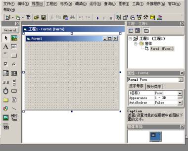 首先我们启动VB,在出现"新建工程"对话框后,选择"标准EXE",单击"打开"按钮,即进入如下图的VB开发环境。