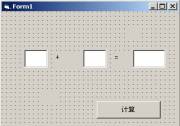 ,移动鼠标指针到窗体Form1上,这时鼠标指针变成了"+"形状。拖出3个并排的有一点间距的方框出来,里面有text1、text2、text3的字样,分别选中它们,按鼠标退格键删除这些字样。再单击"Label(标签)"图标A,在刚才的3个方框之间拖2个标签框,分别键入加号"+"和等于号"=",最后单击"Command(命令按钮)"图标