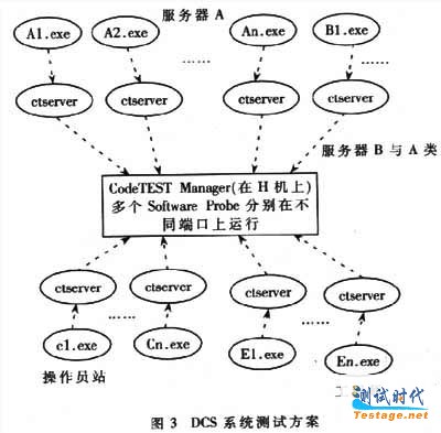 大型DCS综合自动化控制系统的测试方案与上述小系统的测试方案类似,但要考虑插桩函数对DCS系统的影响。为了减轻这种影响,单独用一个配置很高(内存1.5GB)的电脑H,运行codeTestManager采集系统服务器、操作员站和工程师站的各个模块的测试数据。这样服务器、操作员站、工程师站只需运行采集测试数据的服务器ctservei,从而大太减轻测试系统的额外负担。