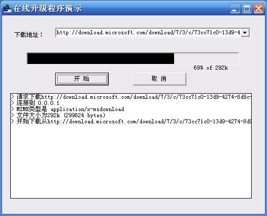 到这里,这个演示程序就完成了,按下F5,在下拉框中选择地址或者输入其他下载地址后按开始就可以开始下载了。我们可以看到连接下载信息,实时的已下载进度情况,并用进度条的方式表现(如图3)。
