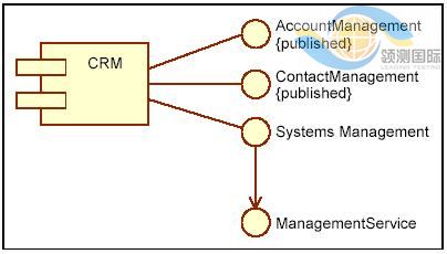第 23 页的图 2-4 定义了客户关系管理 (CRM) 服务的 UML 定义,它表示为一个 UML 组件,实现接口 AccountManagement、ContactManagement 和 SystemsManagement。在这些接口中只有头两个接口是已发布接口,不过,后者是公共接口。注意,SystemsManagement 接口和 ManagementService 接口构成了双接口。CRMservice 可以实现许多这样的接口,但是它以多种方式行为的能力取决于客户端在行为的实现方面是否允许有大的灵活性。甚至有可能给特定类型的客户端提供不同或附加的服务。在一些运行时环境中,这样的功能也用于在单个组件或服务上支持相同接口的不同版本。