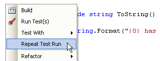 重复运行测试可以说是TestDriven.NET 2.0的一大亮点。TestDriven.NET2.0出现之前,如果在运行测试的过程中,测试代码不能通过,这时我们会花几秒钟时间去修改测试代码,并再次运行测试,但是往往却发现找不到刚才测试的是哪个代码块,这时您可以使用重复运行测试命令,不管你鼠标点击的位置在哪儿,它都会直接运行上一次的测试。