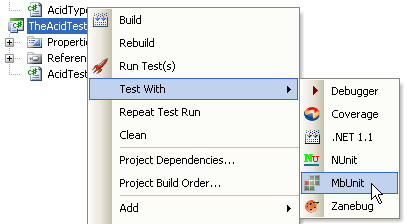 在.NET平台下,单元测试框架有很多,TestDriven.NET 2.0不可能把所有的单元测试框架尽收其中,但是它提供了一种很好的可插拔的机制。当你安装一种新的测试框架后,TestDriven.NET 2.0会自动在它的菜单中出现这一项,在测试项目上点右键选择Test With菜单命令,可以选择使用哪一个单元测试框架。