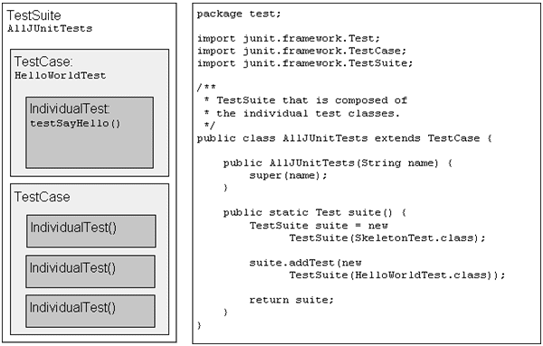 图 1 显示了使用样本 TestSuite 的 JUnit TestSuite 布局。每个测试都由若干单独的测试案例构成。每个测试案例都是一个单独的类,它扩展了 TestClass 类并包含了我的测试代码,即那些曾在 main() 中出现的代码。在该例中,我向 TestSuite 添加了两个测试:一个是 SkeletonTest,我将它用作所有新类和 HelloWorld 类的起点。