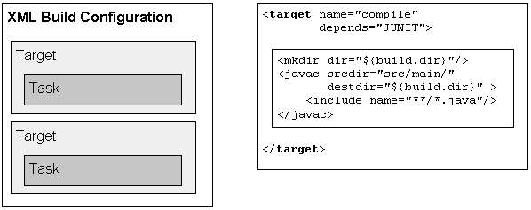 图 2 简要介绍了一个配置文件。配置文件由目标树构成。每个目标都包含了要执行的任务,其中任务就是可以执行的代码。在本例中,mkdir 是目标 compile 的任务。mkdir 是建立在 Ant 中的一个任务,用于创建目录。 Ant 带有一套健全的内置任务。您也可以通过扩展 Ant 任务类来添加自己的功能。