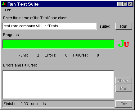 我在图 4 和图 5 中显示了 JUnit GUI,其中所要做的就是将 runtest 目标从junit.textui.TestRunner 改为 junit.ui.TestRunner。当您使用 JUnit 的 GUI 部分时,您必须选择退出按钮来继续构建过程。如果使用 Junit GUI 构建包,那么它将更难与大型的构建过程相集成。另外,文本输出也与构建过程更一致,并可以定向输出到一个用于主构建记录的文本文件。这对于每天晚上都要进行的构建非常合适。