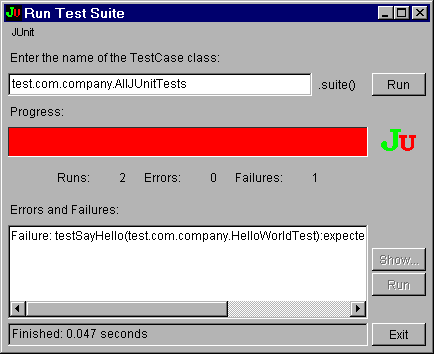 [junit] 1) testSayHello(test.com.company.HelloWorldTest) "expected:<Hello