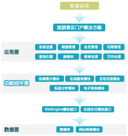 下列内容实现皆基于SiteEngine的标准功能模块体系或需进行必要的扩展,并可以根据各类型景区的切实目标及门户网站的运营需要进行灵活匹配或功能定制建设。