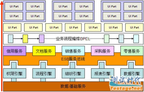 当业务都已标准的SOA服务暴露出去后,我们看到可以通过业务流程编排将我们提供的各种业务SOA服务编排在一起,完成一个完整的业务操作和流程。一个完整的业务流程正是各种SOA服务和引擎的编排和组合。在流程编排过程中我们还可以设置各种业务规则,建立分支,因此在这里是完全可以再抽象出一个独立的业务规则引擎。
