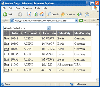 为了查看 SqlDataSource 是如何操作的,让我们先观察一下 Orders_SDS.aspx 页(参见图 4)。有一个 DropDownList 控件,它绑定到一个从 Northwind 数据库中检索客户列表的 SqlDataSource 源控件。