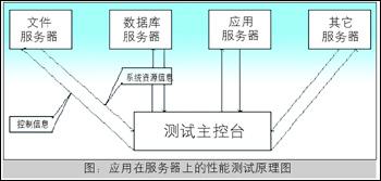 对于应用在服务器上性能的测试,可以采用工具监控,也可以使用系统本身的监控命令,例如Tuxedo中可以使用Top命令监控资源使用情况。实施测试的目的是实现服务器设备、服务器操作系统、数据库系统、应用在服务器上性能的全面监控,测试原理如下图。