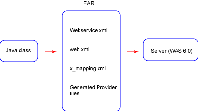 查看 图 8,您会见到在 Web 服务开发过程中 Web 服务向导中发生了什么。大量文件生成以帮助序列化和反序列化这些进出服务的信息。信息同样被加入到 webservices.xml、web.xml 和 x_mapping.xml 文件中。这些信息描述了服务的部署。这些依据的是 J2EE 1.4 标准。 至此所有关于 Web 服务的信息都已部署到了 EAR 上。然后将 EAR 加入到 WebSphere Application Server 中。