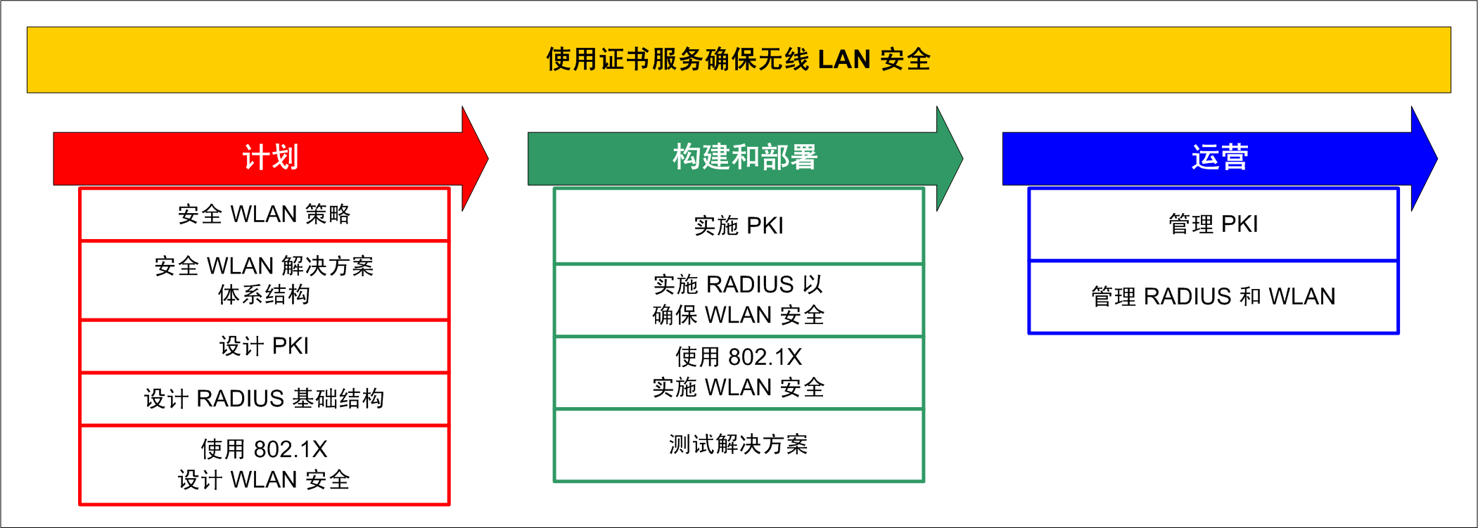 “使用证书服务确保无线 LAN 安全”针对实施 WLAN 安全解决方案的生命周期的各个不同阶段分为一系列指南 ― 规划指南、构建指南、操作指南和测试指南。 (附录中还包括交付指南概述。)本文档还附带一套工具,包括样本项目和风险计划;用于使实施和操作任务自动化的脚本文件;以及一套详细的测试事例,在您自己的环境中构建解决方案时,可使用这些事例来验证该解决方案的功能。