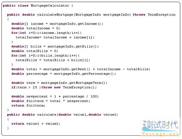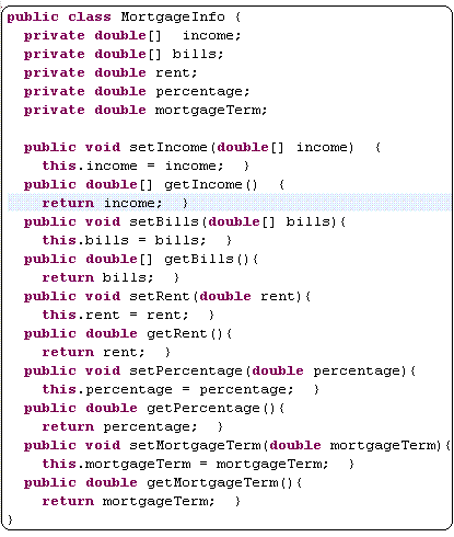 下 图 17 中显示了一个做了所有工作的类并且是真正的 Web 服务类。MortgageCalculator 有两个方法分别称为 calculateMortage 和 MortageInfo,如 图 15 中看到的。calculateMortgage 有一个输入参数。Calculate 有两个 double 型的输入参数。只有在方法中的参数需要遵照 bean 规范。因此,calculateMortgage 方法得到从 MortgageInfo 类收集来的信息并计算用户每月所能负担的金额。当抵押期限大于二十五年时,程序还会抛出 TermException 异常。