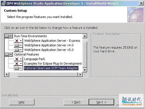 ClearCase LT 的客户机程序和 SCM 适配器的客户机程序都可以从 WebSphere Studio CD 安装。要成功安装 SCM 适配器,您必须在安装 WebSphere Studio 的过程中明确选择 Rational ClearCase Team Adapter,如下所示: