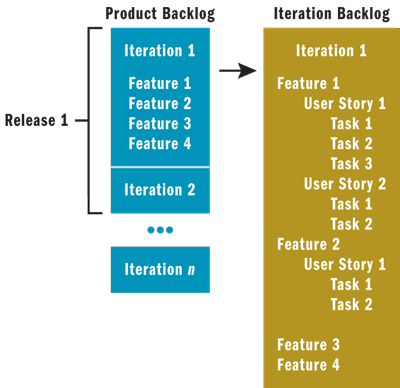 在 Scrum 中,这组用户案例被存放在一个名为“产品积压”的列表中(请参见图 1)。每个小版本中需要处理的工作范围主要取决于团队进度。版本的定义主要取决于按照客户要求完成一组可靠需求的时间。例如,如果需要四个小版本才能实现第一组功能,则预计在第四个小版本后能形成第一个版本。