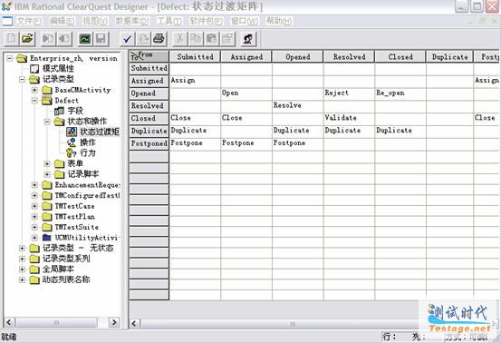 (1) 通过ClearQuest Designer定制RATLC中的需求管理流程。ClearQuest本身内嵌了需求管理、缺陷管理和测试管理流程。同时,鉴于IBM需求管理流程有特殊性的需求, ClearQuest提供了灵活的手段在上述的内嵌流程中进行客户化定制。RATLC就是通过ClearQuest Designer的状态过渡矩阵定制产品需求管理流程中的需求状态和其过渡关系,如图二: