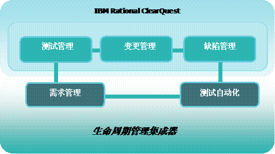 此次我们介绍了IBM软件产品需求管理流程, 它是IBM IPD的一个实例,也就是一个由市场/客户驱动的,跨市场部门、研发产品管理部门及研发工程部门的端到端需求管理流程。此流程在IBM内部的支撑系统RATLC是通过Rational ClearQuest这一优秀生命周期管理集成器来实现(如图七)。Rational ClearQuest涵盖了需求管理、变更管理、缺陷管理和测试管理。