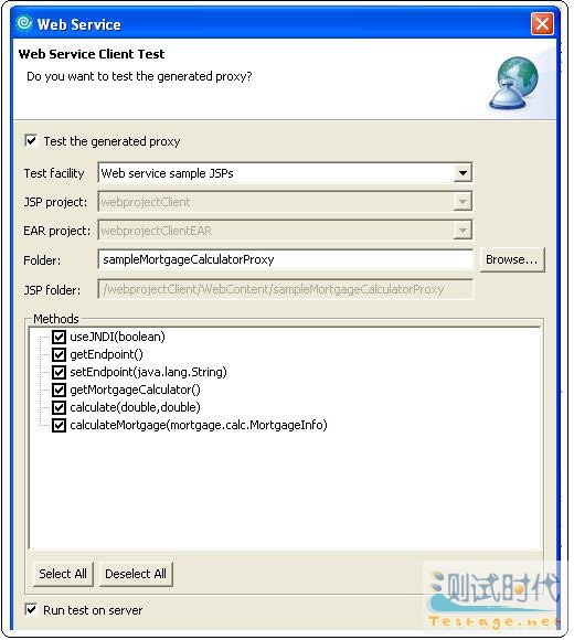 点击 Next 按钮,您会见到 Web 服务页面,如 图 20 所示。确保选取了 Generate a proxy 和 Test the Web service 项。并且选择 Overwrite files without warning项。 如果确信在 Web 服务首选项中是 GSTC 默认的 Web 服务测试客户程序,就点击 Finish 按钮。 如果不确信,则点击 Next 直到您达到了客户程序测试页并从测试工具下拉框中选择 Web Service JSP page,如 图 21 所示。