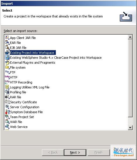 尽管您的 UCM 工作区(视图和流)与您的 WebSphere Studio 工作空间概念上相似,但是它们并不(很可能不应该)在文件系统中的同一位置上。从 ClearCase 工作区抽取的项目助诊文件可以导入 WebSphere Studio 工作空间,该工作空间有一个 .metadata 目录包含与当前工作空间的项目结构相关的元数据。该 .metadata 目录的内容都不适用于源代码控制,因此建议您不要将工作空间目录与 ClearCase 工作区放在同一位置。 ClearCase 是在 ClearCase 工作区查找变更过的源文件和子目录以交付给共享的小组工作区,因此如果 ClearCase 把元数据文件中的变更解析为将跟踪和管理的相关变更,WebSphere Studio 创建的元数据目录会产生问题。因此,加入项目操作完成后,您应该将 UCM 项目组件导入 WebSphere Studio。如果那些组件已经是 WebSphere Studio 项目形式(Java 项目、Web 项目等等),那么您可以通过选择 File => Import => Existing project into workspace 将它们导入,并在 Development View 中指定项目位置为相应的项目,如图 10 与图 11 所示。在当前 WebSphere Studio 工作空间下以同样的方法将其导入 WebSphere Studio 项目,然而在 UCM 工作区则保留其位置。