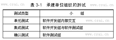 承建单位为了保证工程质量和进度,在目标计算机系统或业主单位批准的等同系统上,对每个计算机软件单元、计算机软件部件、整个软件系统进行测试。这种测试是为了确保最终交付项目的功能符合业主单位的需求,使承建单位尽可能在交付业主单位之前发现问题并改正。承建单位组织的测试见表3-1。