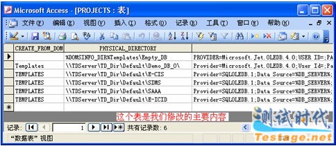 d.PROJECT表中主要增加或修改一个记录就行了,其关键字段表示的意思是PROJECT_ID(项目ID号不能重复),PROJECT_NAME(项目名称),DB_NAME(项目对应的数据库名称如本例的default_e_cis_db),DB_TYPE(数据库类型1为ACCESS,2为SQL SERVER),PHYSICAL_DIRECTORY(TD服务器中的共享目录如本例为\\10.168.188.152\td_dir\default\e_cis、DB_USER_PASS(TD用户密码如本例为tdtdtd)、DBSERVER_NAME(数据库的IP地址)。