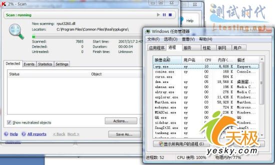 此版本在资源占用率上同样给笔者留下较好印象,其空闲时只有6个点左右,扫描进行时会达到10-20个点,与NOD32不相上下。