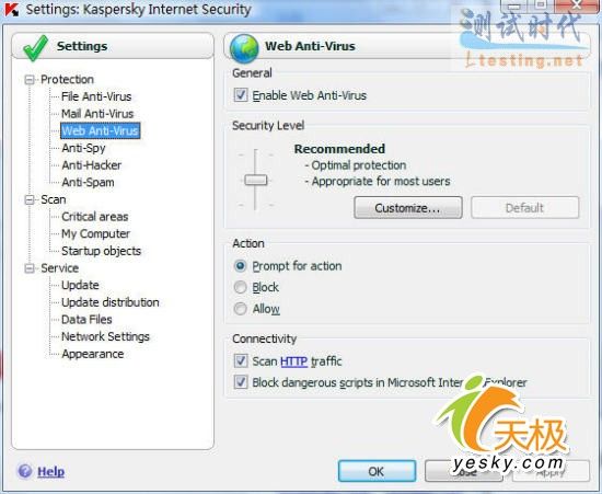 卡巴斯基具有丰富的安全配置功能,通过实际使用,其所有功能在Vista系统下都能较好的运行。