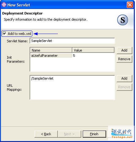 您可以控制创建 servlet 时 Application Developer 对部署描述符和其他文件的自动更新。图 3 显示了 File=>New=>Servlet 向导中的最后一页,此处向 web.xml 自动添加基本部署信息的复选框是缺省选中的: