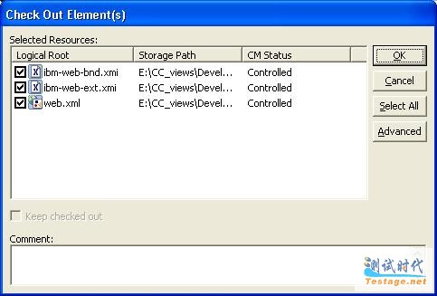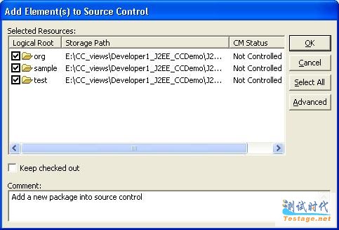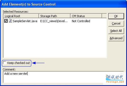 方便的是,如果您计划在将新的构件加入源代码控制后直接使用它,可以选择 Keep checked out,如上图 7 所示。当选择 OK 后,将弹出和上图 5 相同的对话框再次提醒您,因为虽然当这个对话框第一次出现时,现有的文件被 Application Developer 自动更新,但是这些更新需要和一个活动相关联。这个对话框需要第二次出现,是因为向源代码控制中添加新 servlet 类的操作需要和一个活动相关联。