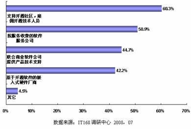 就业机会;有半数(50%)认为提供服务收费的软件服务公司,是目前开源企业商业化的最好模式。此外,在软件和硬件方面,有超过40%的开源爱好者认为,联合商业软件公司提供产品的技术支持与基于开源软件的