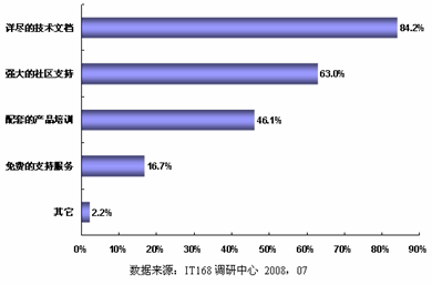 培训占46.1%。而需要免费的支持服务的只占16.7%。从调查结果上看,“详尽的技术文档”对于用户的重要性非常高,从而