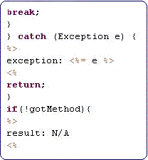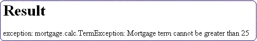 图 37 是一幅抛出由于抵押期限大于 25 年而引发了 TermException 异常的画面。 图 38 显示了在 result.jsp 底部尚未更改的代码。这就是异常被捕获并且显示出原始的信息的位置。