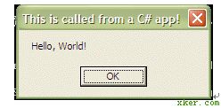 using System;using System.Runtime.InteropServices;class MyClass{ [DllImport("user32.dll")] static extern int MessageBoxA(int hWnd, string msg,string caption, int type); public static void Main() { MessageBoxA(0, "Hello, World!", "This is called from a C# app!", 0); }}程序经编译后执行输出: