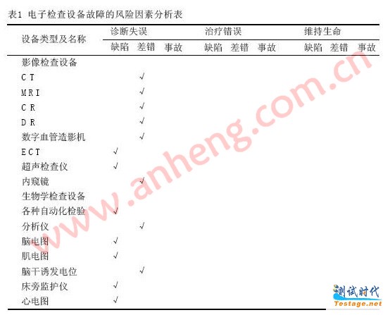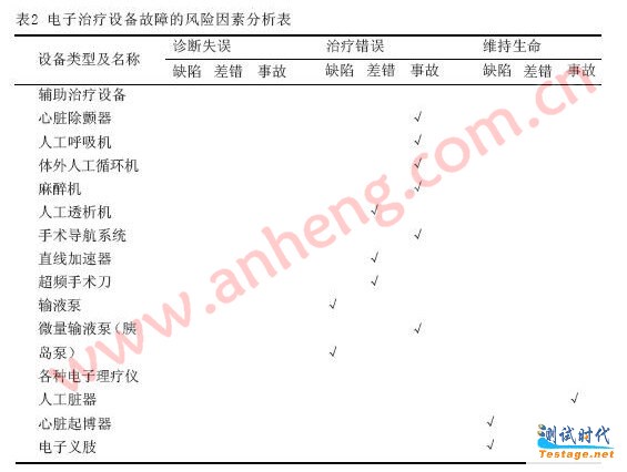 电子医学设备按照功能大体分为检查设备、辅助治疗设备和人工脏器三大类。任何一类设备发生故障,均可能造成诊断失误、治疗错误、危及病人生命健康等危害。保证这些设备的正常运行,是医疗安全管理的重要内容。上述设备故障的风险因素分析见表1和表2。
