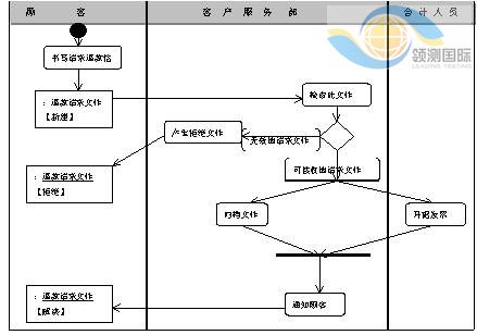·活动图( Active Diagrams )用图形的方式来对商业使用的案例进行工作流程建模。表示出工作流程的步骤,工作流程中的决策点,谁负责完成每个步骤,哪个对象受到此工作流程的影响。例如一个客户收到一个有缺陷的产品并要求退款,客户服务部受理该事务,这一系列活动用 UML 图中的活动图表示如下: