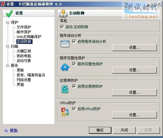 《金山毒霸2007》中的聊天工具嵌入防毒,提供的保护对象较多,可以对QQ、ICQ、MSN、OFFICE等进行保护。《江民KV2007》可以嵌入OFFICE办公组件、FLASHGET、WINRAR、WINZIP等软件。《瑞星2007》提供了OFFICE和IE嵌入防毒。《卡巴斯基反病毒软件6.0》则在主动防御模块中提供了OFFICE、程序完整性等多项防护措施(如图04)。