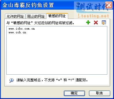 《金山毒霸2007》中的网页反钓鱼模块除了黑白名单以外,还有一个非常实用的敏感网址保护功能,在“敏感的网址”列表中把常去的一些网络银行地址、在线支付地址,以及网上商城地址添加进去。当你打开与这些网址近似的网站时,软件会在IE浏览器中进行页面提示,这用来识别那些在网址中用数字1假冒字母l,用字母O假冒数字0的钓鱼网站非常有效(如图05)。