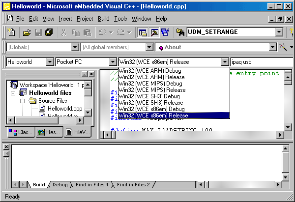 选择 Win32 (WCE x86em) Release 或 Win32 (WCE x86em) Debug 作为活动配置。在屏幕快照下面标记下拉菜单。
