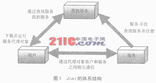 尽管Jini系统由三部分组件组成,但是它们之间的界限是模糊的,组件之间紧密相连、彼此协作。Jini是建立在分布式系统、经常动态变化这一原则之上的。它的体系结构如图1所示。