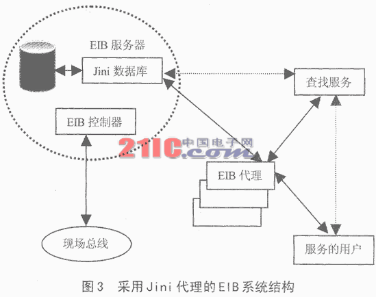 EIB中的设备(例如传感器)都是资源非常有限的设备,很难直接支持Jini,而且EIB系统使用的底层通信协议也不支持Jini。因此在实现中,采用Jini代理体系结构来使EIB设备接入Jini网络。系统结构如图3所示[2]。