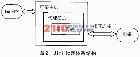 可宿主机在Jini网络和设备两者之间建立连接,在Jini网络中充当这个设备的代言人。设备和代理宿主之间可以用有线或无线的方式相互连接。连接也可以采用任何的协议,有线连接如TCP/IP、RS-232、USB和IEEE1394等;无线连接可以采用蓝牙协议。