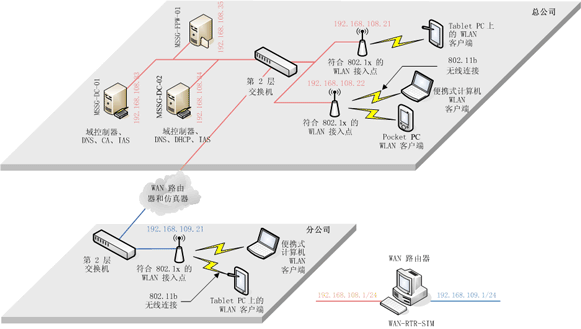总部网络位于一个将无线客户端和域服务器置于单个子网的网络。分支机构站点拥有一个单独的网络并位于不同的子网中。链接总部和分支机构的路由器包括模拟的 WAN 滞后时间和带宽限制。无线 AP 的空间范围比较大,以便用户能够在其中漫游。