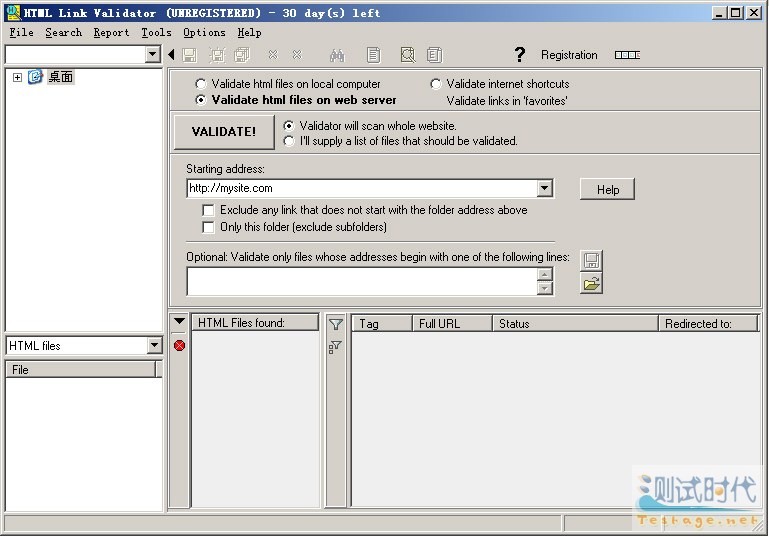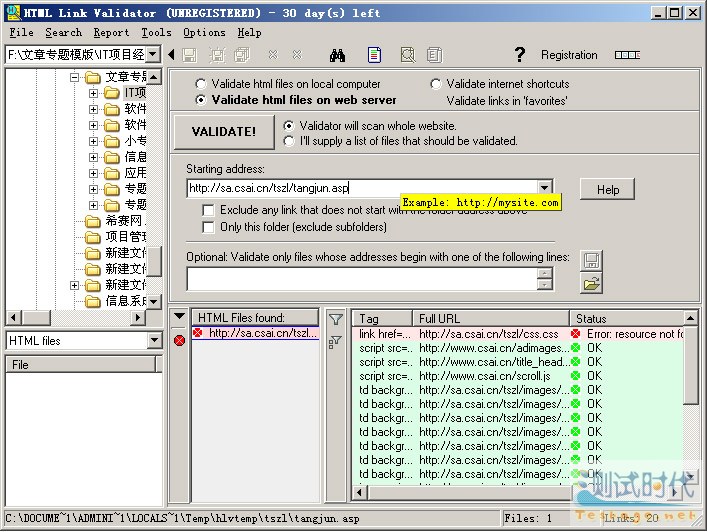 除了测试本地网站,还可以测试远程网站,选择测试方式为“Validate html files on web server”,然后在“Starting address:”中输入被测试网站页面的URL,会车后即开始对指定页面开始测试,如下图所示。